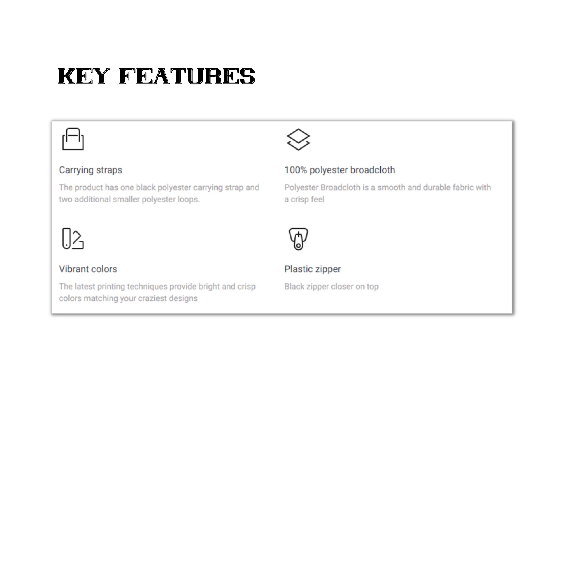 .: Black zipper, polyester carrying strap and tabs